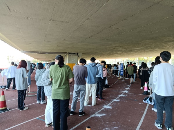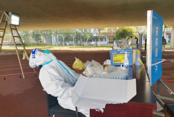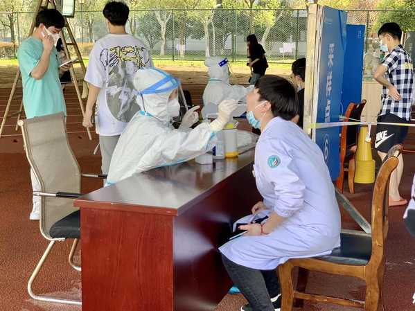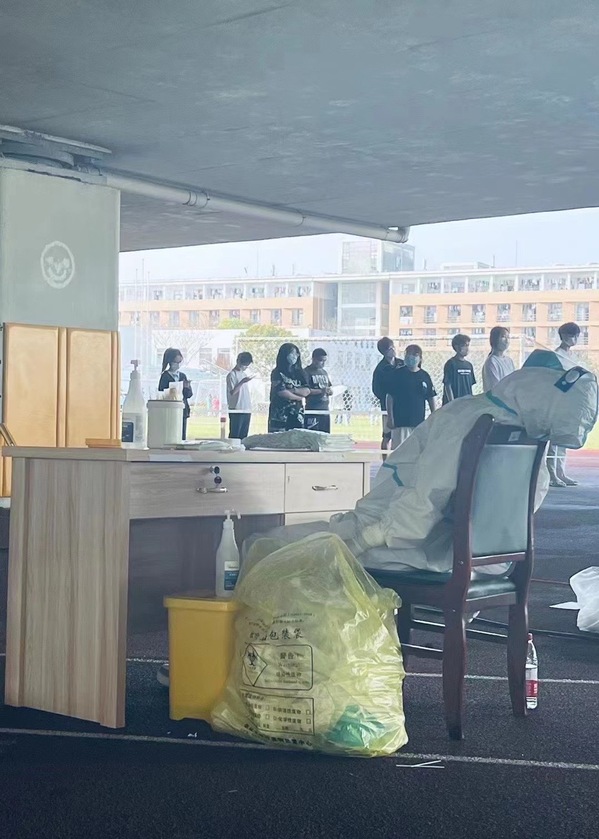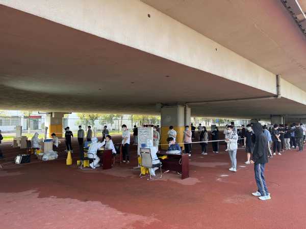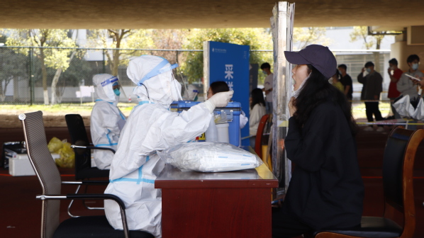 学生们正在有条不紊地进行核酸检测。