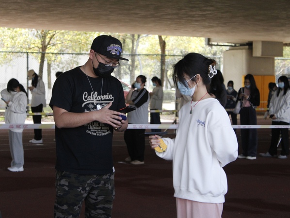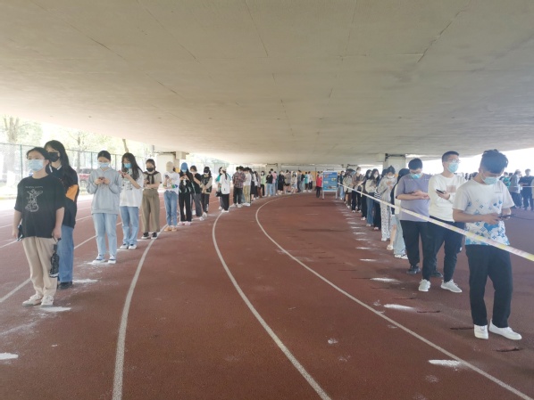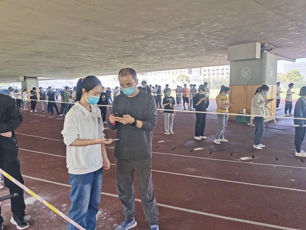 留校教师在前一天做过核酸检测结果为阴性后,纷纷化身志愿者,在现场维持秩序,帮助学生进行信息核对等工作。