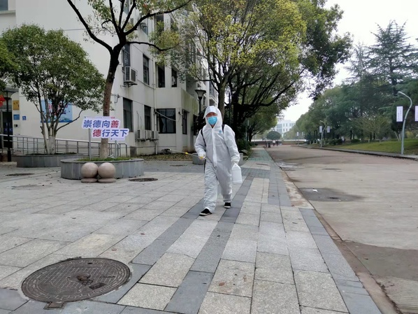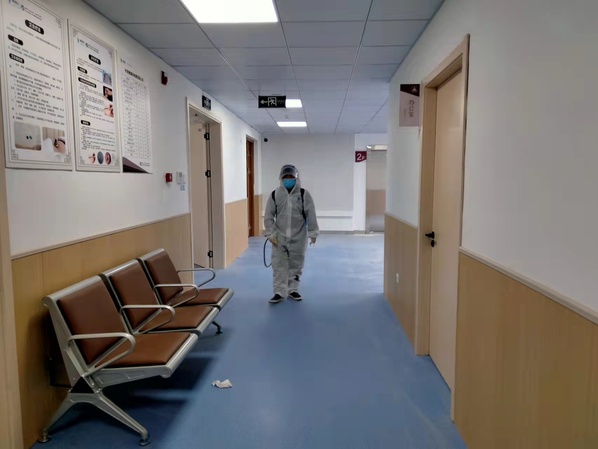 不放过一个卫生死角,工作人员正在进行环境消毒工作。