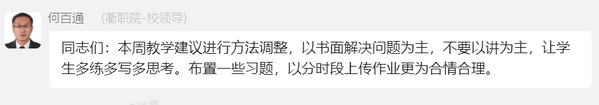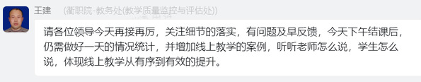 加强监管、确保教学质量优质高效。为切实加强对线上教学质量的监控和管理,学校领导随机进入教师的直播课堂听课,及时跟踪学生对线上课堂教学效果反馈,记录观课中发现的亮点和不足。在二级学院专业主任进入到本专业的所有教学群,公共课课程组长进入到该课程所有老师的教学群的基础上,相关部门领导全覆盖听取教师线上授课内容,校内督导也适时加大线上教学的督查与反馈。