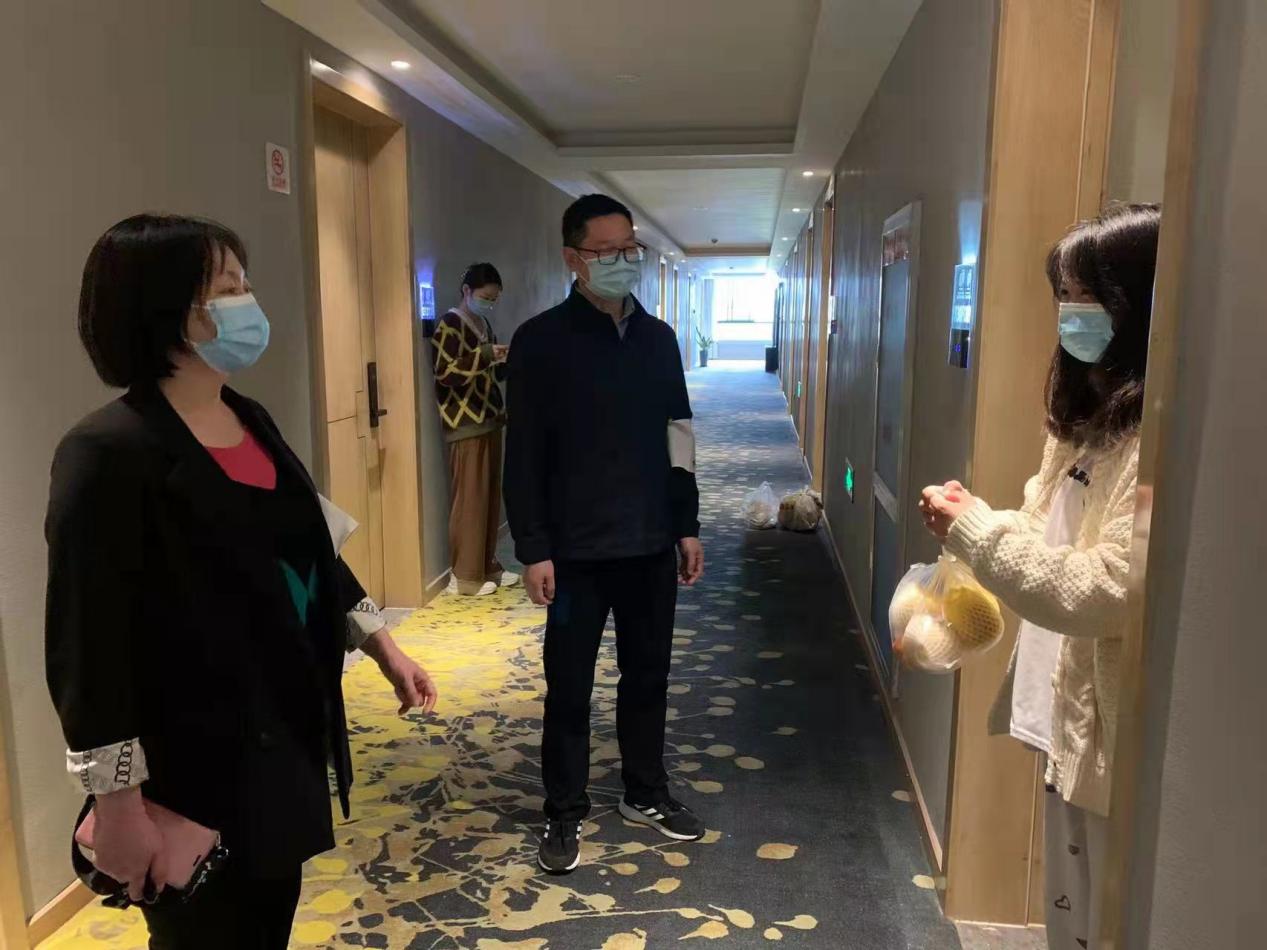 隔离不隔爱,3月19日下午,第三战区指挥长、党委委员、校党委组织部部长周帅,医学院院长姚水洪前往西门酒店亲切看望了第三战区正在接受健康观察的学生,并为他们带去了水果等慰问品。