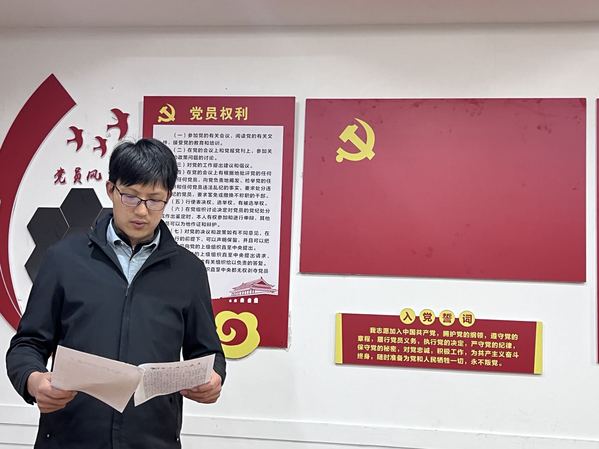郑凌晨同志满怀深情地宣读入党志愿书,回忆入党之初,对党组织的认识很大程度上只是停留在书本上、电视上,遥远而抽象、神圣而光荣。但在2008年就读大一时,突发的一场汶川大地震,亲眼看到身边一群又一群老师、学生党员积极组织广大师生捐钱、捐物、献血等活动支援汶川,那些一个个冲锋在前、无私奉献的身影令他深受触动,从那一刻开始,他就决定一定要加入党组织,像其他党员同志一样为更多的人服务。当前,我国多地区甚至自己的家乡衢州均处于疫情肆虐的危难之中,作为后勤保卫处的党员更应该有担当作为,积极投奔到疫情防控的工作之中,为师生多作服务。