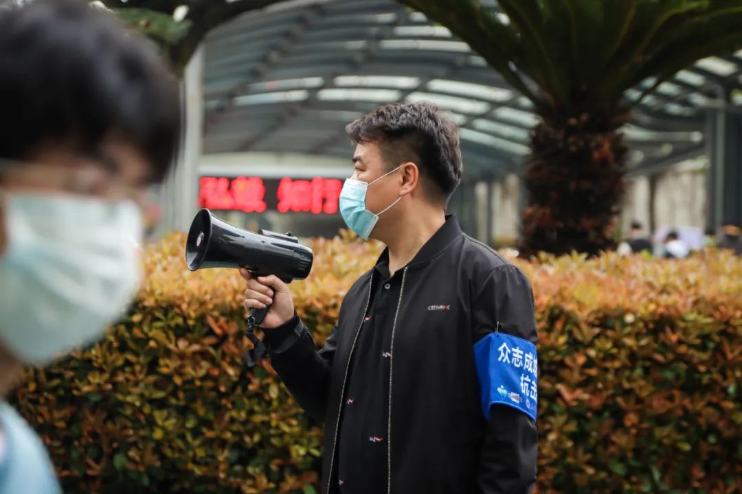 二号战区副指挥长林繁昌拿着喇叭现场指挥二号公寓全体学生去操场做全员核酸。