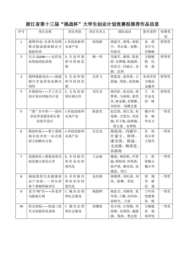 根据浙江省第十三届“挑战杯”大学生创业计划竞赛工作要求,我校组织开展了挑战杯作品申报工作,经各二级学院组织申报、专家综合评审,现将拟推荐省赛作品进行公示。公示时间2022年4月5日-4月7日,共3天,联系电话:8068210,13505707877。