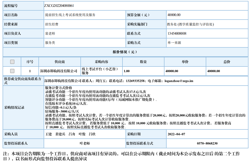 江南网页版提前招生线上考试自行采购信息公示