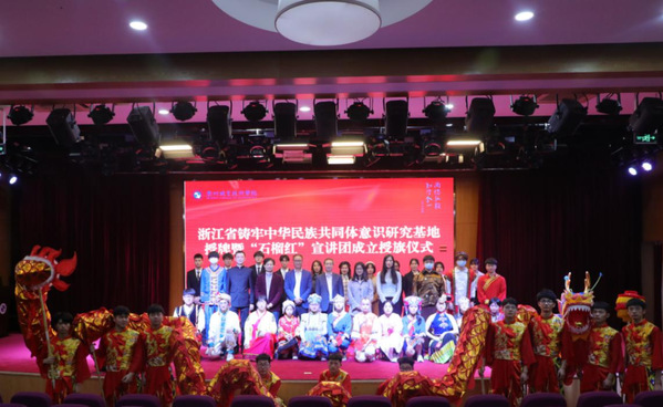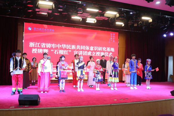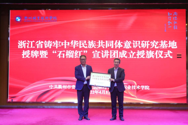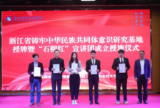 4月8日,江南网页版联合衢州市委统战部(民宗局)举行浙江省铸牢中华民族共同体意识研究基地授牌暨“石榴红”宣讲团授旗仪式。衢州市委统战部副部长、民宗局局长郑浩,江南网页版党委委员、宣传部(统战部)部长孔庆红参加活动。