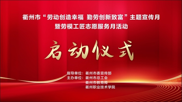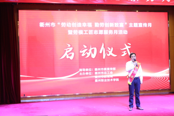 4月24日,衢州市“劳动创造幸福 勤劳创新致富”主题宣传月暨劳模工匠志愿服务月启动仪式在我校举行。校党委书记徐须实,市总工会党组书记、常务副主席郑小龙,市精神文明建设指导中心主任毛明华,市教育局党委委员、副局长曾金松,我校党委委员、副校长余建军,市总工会党组成员、经审会主任江国庆等出席仪式。