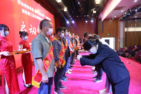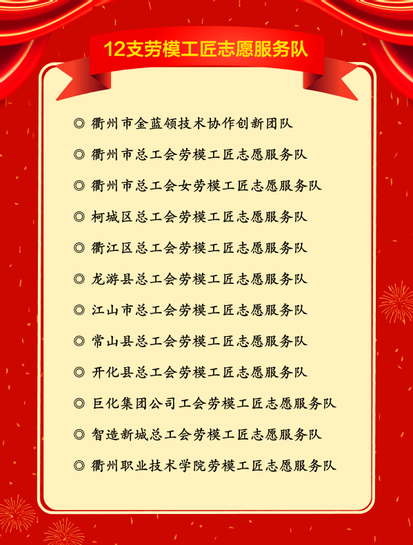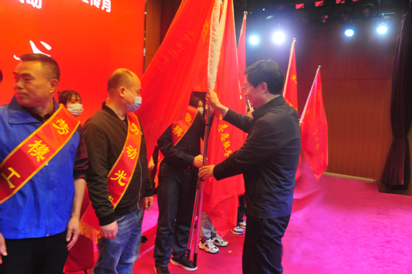 徐须实、郑小龙、毛明华、曾金松、余建军、江国庆为江南网页版劳模工匠志愿服务队等12支劳模工匠志愿服务队授旗。