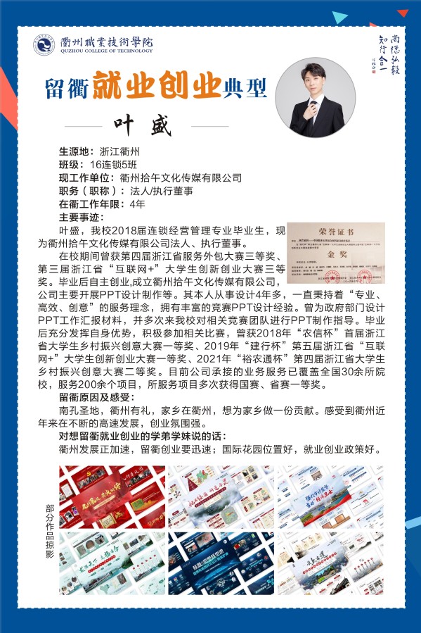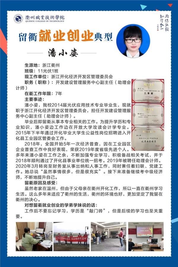 近年来,随着衢州经济社会的发展和就业环境的提升,有越来越多的学长学姐毕业后选择留在衢州就业创业,成为一名新衢州人。其中,更是涌现出不少优秀的典型。本期,让我们走进优秀校友潘小姿、叶盛的留衢就业创业故事。