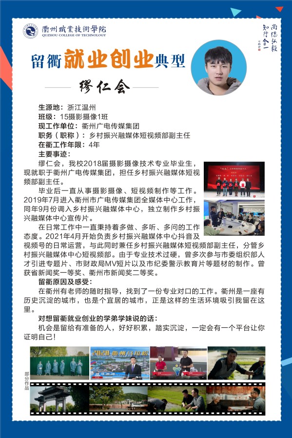 近年来,随着衢州经济社会的发展和就业环境的提升,有越来越多的学长学姐毕业后选择留在衢州就业创业,成为一名新衢州人。其中,更是涌现出不少优秀的典型。本期,让我们走进优秀校友缪仁会、王凯的留衢就业创业故事。