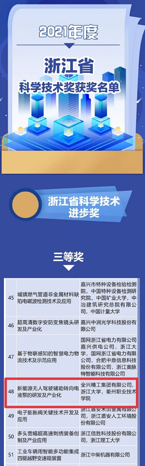 7月11日下午,2021年度浙江省科学技术奖励大会在省人民大会堂隆重举行。省委书记袁家军、省长王浩等省领导向浙江省科学技术奖获奖代表颁奖。我校信息工程学院顾怡红老师参与的“新能源无人驾驶辅助转向电液泵的研发及产业化”项目成果获2021年浙江省科学技术进步奖三等奖,实现了我校省科学技术奖“零”的突破,反映了我校在双高标志性成果建设上迈出了坚实一步。