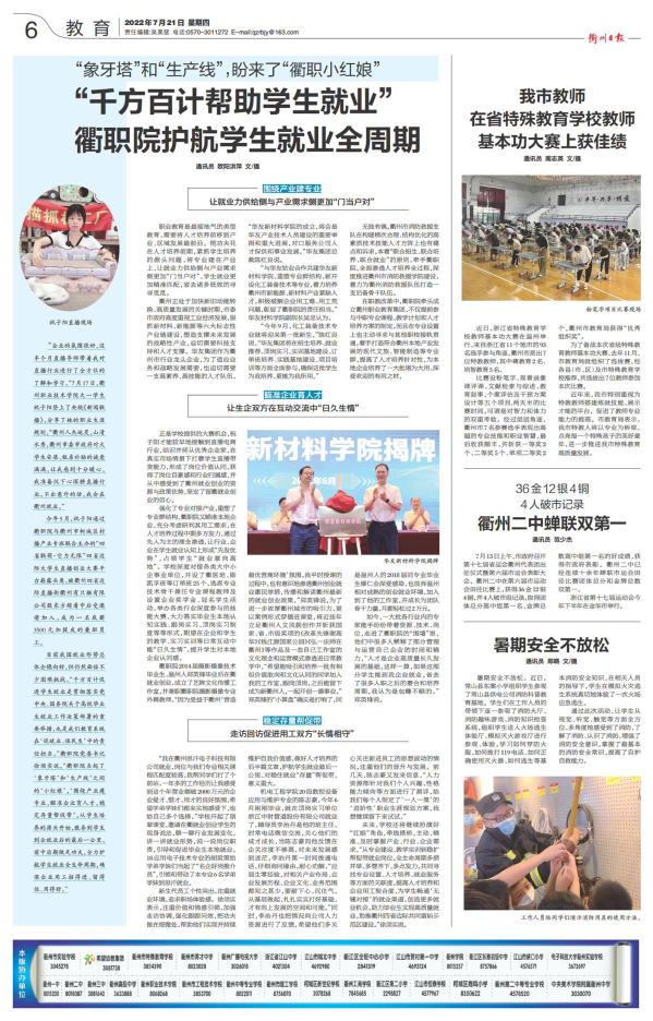 “千方百计促进学生就业是贯彻落实党中央、国务院关于高校毕业生就业工作决策部署的重要举措,也是我们教育系统在‘促就业、保民生’中的责任担当。”衢职院党委书记徐须实说,“衢职院当起了‘象牙塔’和‘生产线’之间的‘小红娘’,‘围绕产业建专业,瞄准企业育人才,稳定存量帮促带’,从学生培养的源头开始,服务到学生到企就业后的最后一公里,前中后期做足功夫,全力护航学生就业全生命周期,确保企业用工招得进、留得住、用得好。”
