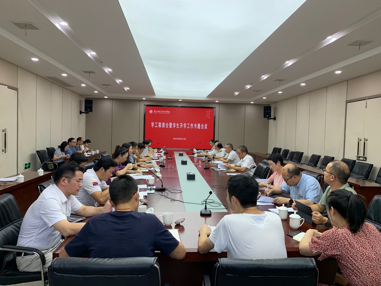 8月23日下午,我校在行政楼四楼会议室召开学工联席会暨学生开学工作专题会议。会议由党委副书记何百通主持,党委委员、宣传部部长孔庆红,办公室、宣传部、学工部、教务处、计财处、后勤保卫处、团委、数字校园建设中心、图书馆等相关部门及各二级学院相关负责人参加会议。