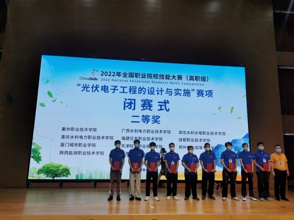 8月24日,2022年全国职业院校技能大赛高职组“光伏电子工程的设计与实施”赛项落下帷幕。我校信息工程学院蒋昱瑶、陆晟、常新宇三位同学代表浙江队参赛,在廖东进、郑孝怡、江达飞老师的指导下,荣获二等奖(全国55支代表队位列第7名),这是我校在该项“双高”标志性成果中取得的最好成绩。