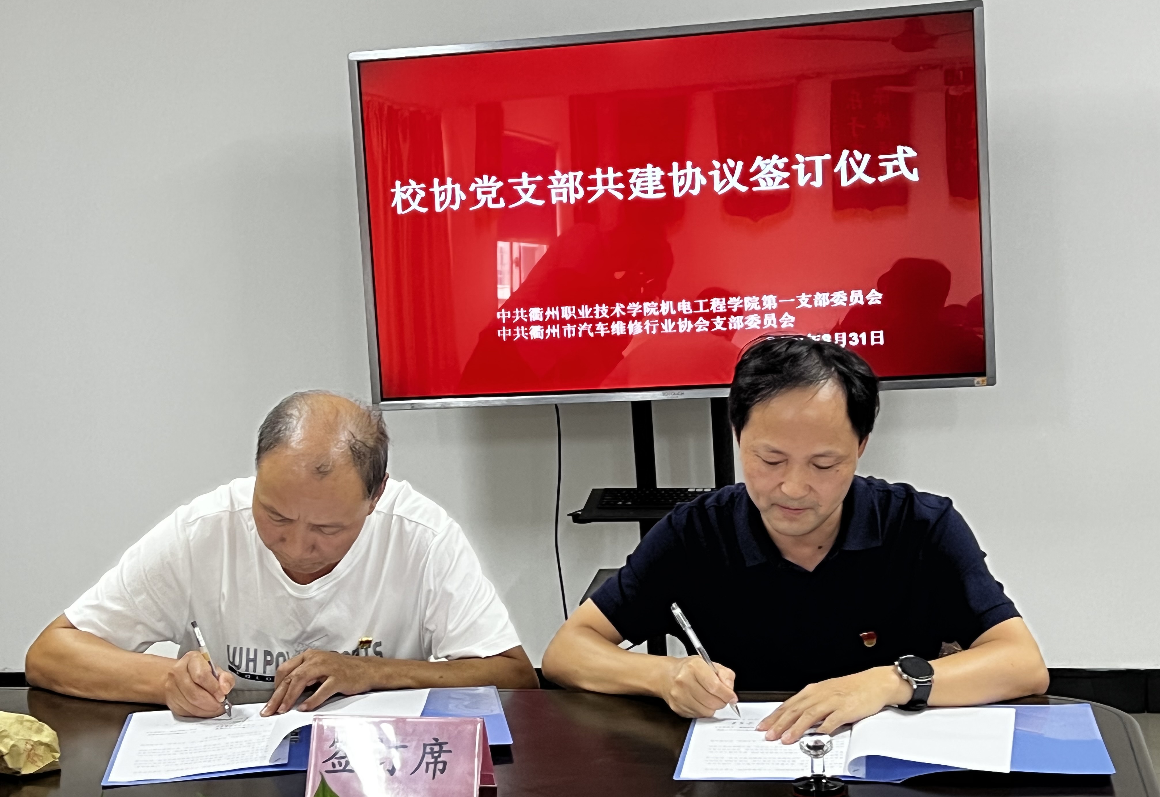 为创新基层党建工作载体,提高基层党建工作水平,本着“资源共享、优势互补、互相促进、共同提高”的原则,8月31日下午,机电第一党支部与衢州市汽车维修行业协会党支部在衢州市车辆综合性能检测有限公司开展校协党支部共建签约仪式。机电党总支委员、院长魏小华,衢州市汽车维修行业协会秘书长胡伟民,会长朱文富参加活动,机电第一党支部书记余富忠,行业协会党支部书记叶云钢代表签约,校协双方党员共同参加此次活动。