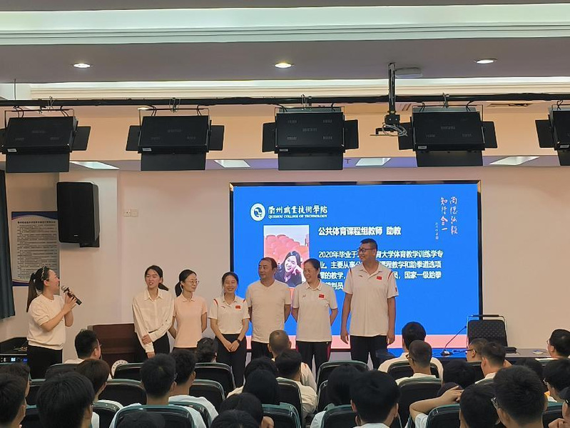 接下来,文化旅游学院领导班子、休闲体育组教师、公共体育组教师、学工服务团队相继上台,李威书记向新生们介绍学院老师的分工,消除师生间的陌生感,拉近了师生关系。