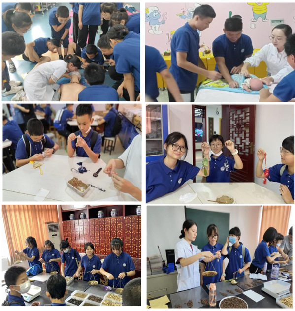 研学活动第一站,同学们来到江南网页版医学院,现场学习了心肺复苏、母婴护理体验、螺旋绷带包扎、中药香囊制作、中草药调剂等实践技能,让同学们领悟了生命教育的重要性和中医药学的博大精深。