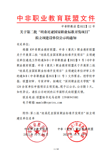 10月16日,中非职业教育联盟公布了第二批“坦桑尼亚国家职业标准开发项目”拟立项建设单位名单,我校成功入选护理员5级、软件工程技术员4级岗位职业标准建设项目参与单位。