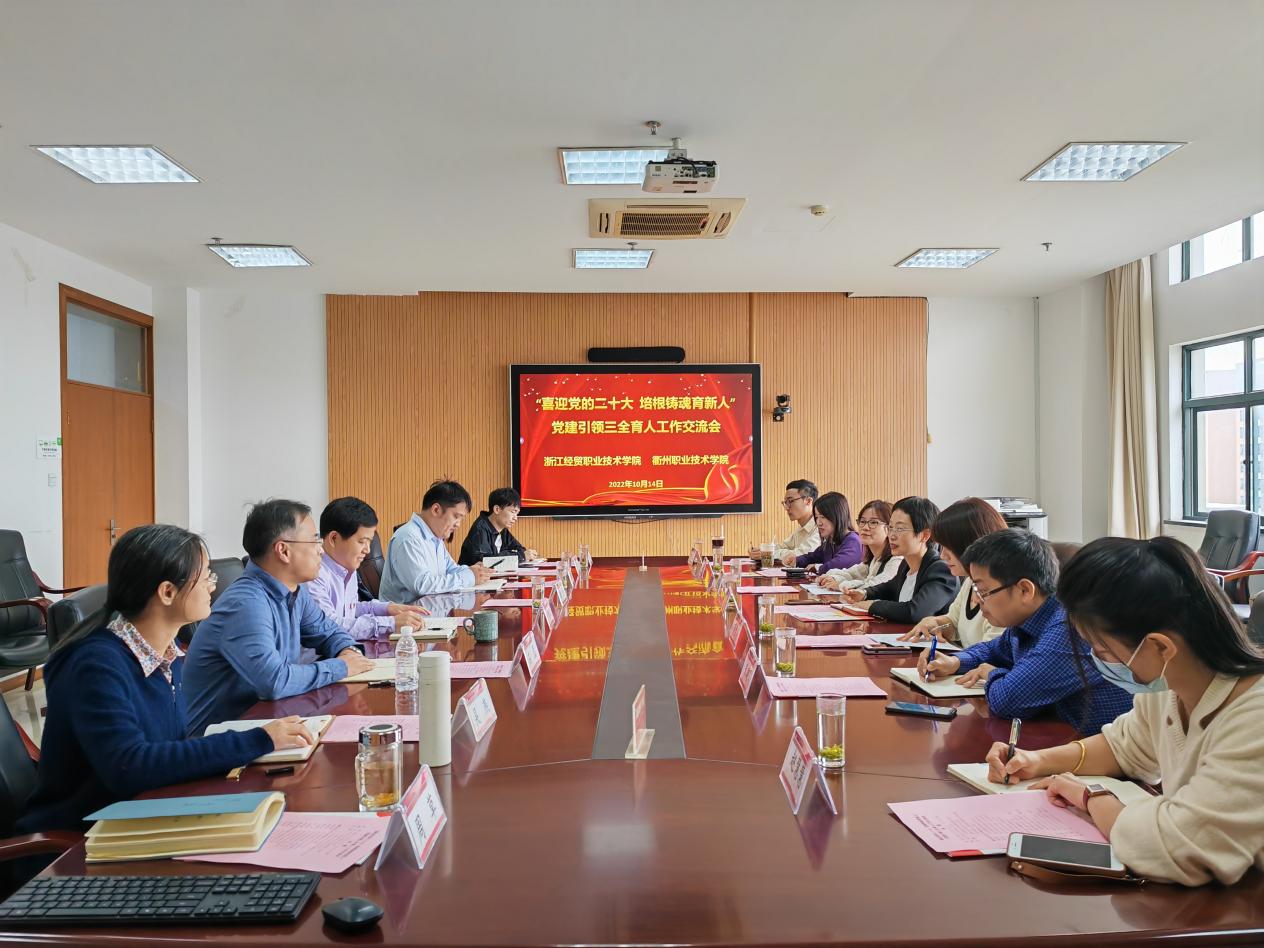 近日,经济管理学院党总支书记斯彬彬、副书记蒋雪芬、校样板党支部、经济管理学院第二党支部书记陶莉莉等一行,赴浙江经贸职业技术学院进行党建“双创”工作调研。浙江经贸职业技术学院工商管理学院党总支书记、院长颜青,财务会计学院党总支书记、院长李国辉等出席。
