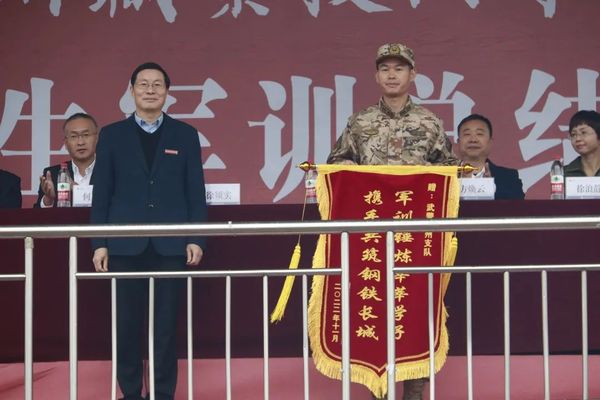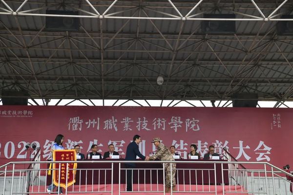 姚水洪宣读2022级学生军训工作优胜集体和先进个人名单,校领导和承训部队领导为2022级学生军训工作优胜集体和先进个人颁奖。徐须实代表学校向驻衢武警支队赠送了锦旗。