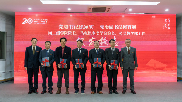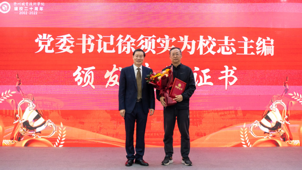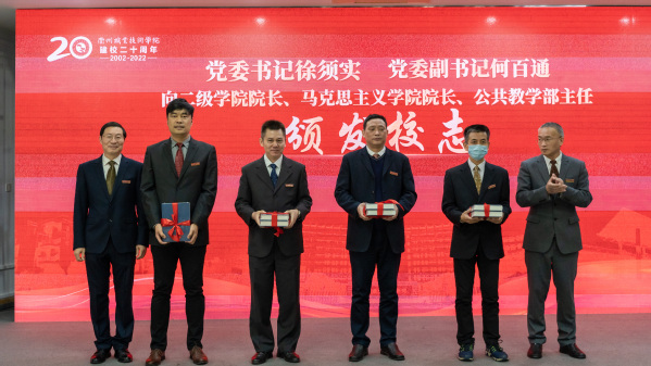 徐须实、何百通为校志揭幕,并向二级学院、马克思主义学院、公共教学部代表颁发校志。