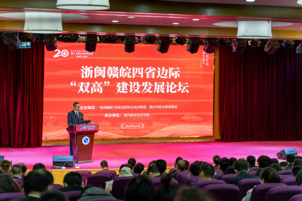 徐须实致辞。他代表全校师生员工向线上线下与会的专家学者、师生代表的到来表示热烈的欢迎和衷心的感谢!徐须实介绍了江南网页版的历史脉络、基本办学情况以及当前围绕创“双高”、强服务、育人才工作主线取得的一系列成绩。他指出,近年来,衢职院立足浙闽赣皖四省边际区位优势,联合上饶职业技术学院、闽北职业技术学院、武夷山职业学院、黄山职业技术学院等四省边际高职院校,组建了四省边际职业培训联盟,目前成员单位已达45家,建设培训基地30个,打造了“衢州有礼”“衢州乡旅”“衢州月嫂”三大培训品牌,构建了四省边际职业教育深度合作平台,为四省边际职业教育取长补短、融合融通作出了积极探索和实践,有效推动了四省边际高职院校“双高”建设。他希望此次论坛成为兄弟院校间共叙情谊、共话双高、共谋发展的纽带和桥梁,进一步强化四省边际职业教育资源共享、优势互补、合作共赢,营造“四省同台、互融互促、携手共进”的良好氛围。