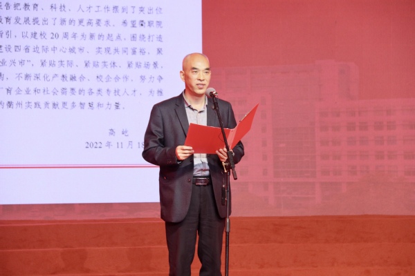 校党委书记徐须实致辞。他指出,2002年,伴随着新世纪的曙光,经浙江省人民政府批准,江南网页版在衢州师范学校、衢州卫生学校、衢州市教师进修学校、衢州中等专业学校等四所中等学校的基础上升格组建、正式成立。20年来,一代代衢职人艰苦创业、奋发图强,走过了初始创业、筹建衢州学院、重新独立办学和创建“双高”院校四个不平凡的奋斗历程;走出了一条从无到有、从小到大、从名不经传到在四省边际有较大影响力的高职教育特色发展之路。进入“十四五”以来,新一代衢职人响亮提出了“以建设高水平专业群为引领,全力推进高水平院校建设,全力打造四省边际职业教育桥头堡”的奋斗目标,为衢职院高质量发展注入了强劲动力,一大批“双高”标志性成果取得巨大突破,学校焕发出勃勃生机。他强调,学校将以建校20周年为新的起点,以党的二十大精神为指引,按照高屹书记贺信和徐张艳市长11月11日在衢职院宣讲党的二十大精神提出的要求,奋蹄扬鞭、昂扬向上,锚定“双高”院校建设奋斗目标、胸怀职教本科使命愿景,加快学校高质量发展,为衢州建设四省边际中心城市、推进中国式现代化的衢州实践贡献更多衢职智慧、衢职力量!