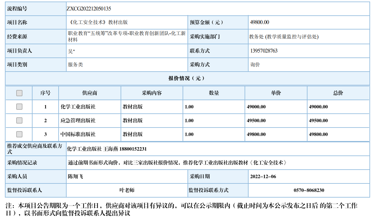 江南网页版《化工安全技术》教材出版自行采购信息公示