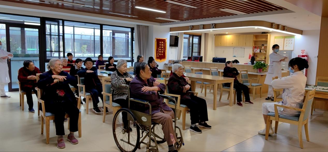 师生们在信安街道居家养老服务中心教老人们做每日健身操