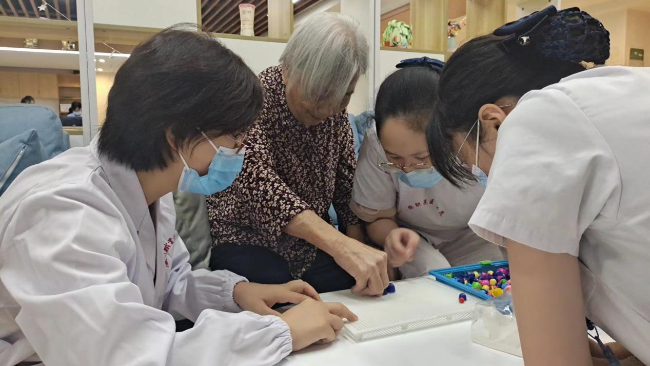 团队师生们在信安街道居家养老服务中心指导老人训练手功能