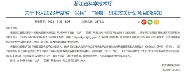 据悉,“尖兵”“领雁”研发攻关计划由浙江省省级财政资金设立,面向世界科技前沿、面向经济主战场、面向国家和浙江重大需求、面向人民生命健康,开展重点技术领域的前沿科学问题研究、重大关键核心技术攻关、重大社会公益性研究、重大国际科技合作等研究活动的科技计划。“尖兵计划”即以实现技术安全自主可控为目标,按照“急用先行、重点突破”的原则,围绕数字安防、射频芯片、智能网联汽车、区块链、5G、脑机融合、碳捕集利用和封存、智能农机装备、海洋智能装备等重点领域,推进1-3年的相对短期、小切口的关键核心技术攻关任务;“领雁计划”即以抢占科技制高点为目标,按照“长远部署、系统推进”的原则,从已有优势和潜在优势出发,围绕专用芯片、人工智能与融合应用、先进制造与智能装备、氢能与燃料电池、新型柔性与磁性材料、重大疾病精准诊疗、新药创制与医疗器械等重点领域,推进5-10年中长期、持续化、系统性的攻关任务。