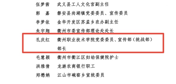 日前,浙江省委宣传部发布《关于表扬2022年浙江省基层理论宣讲成绩突出集体和个人的通报》,我校党委委员、宣传部(统战部)部长孔庆红荣获2022年浙江省基层理论宣讲成绩突出个人。