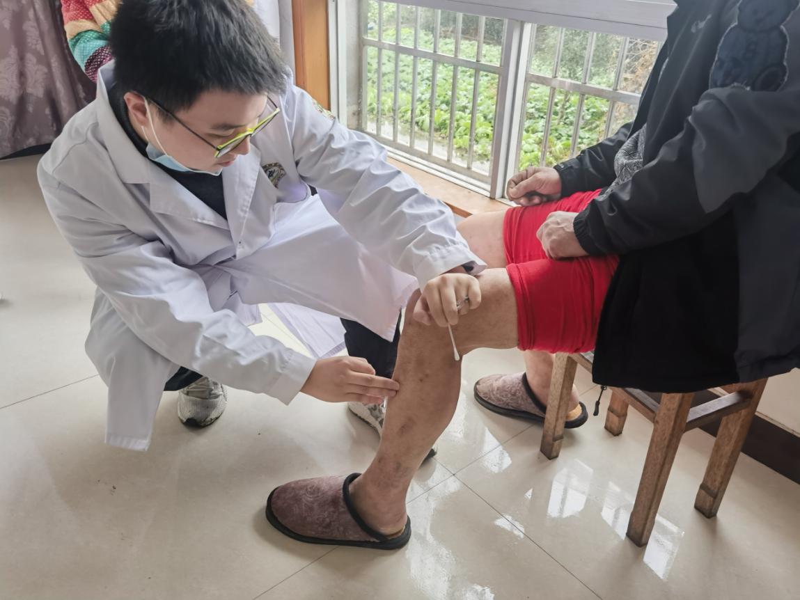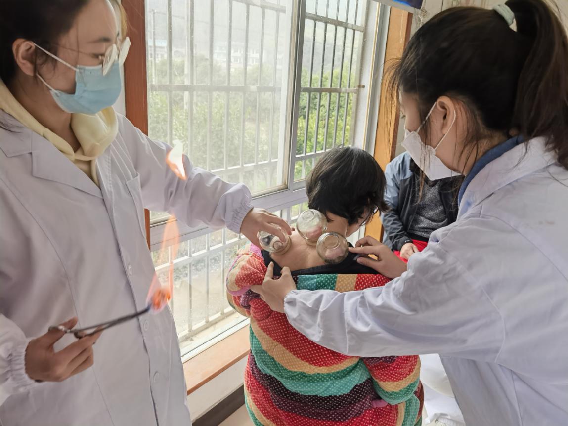 活动现场,医学院第一党支部师生们忙着为村民们测量血压、送上慢性病常用药物,耐心解答大家提出的各类健康咨询,详细询问他们的身体状况,为村民科普新冠“阳康”后的康复指导与中医调理,还根据老年人个人体质和基础疾病,为一些有慢性疼痛的患者进行针灸、拔罐等中医特色治疗,受到了村民的一致点赞和好评。