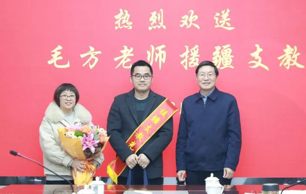 2月23日下午,我校召开毛方老师援疆欢送会。校党委书记徐须实,党委委员、副校长徐浪静出席,党委委员、副校长姚水洪主持。