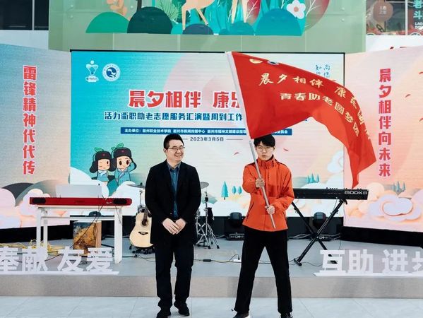 衢州团市委副书记黄泽文为衢职院大学生志愿者代表授“青春助老圆梦团”旗帜