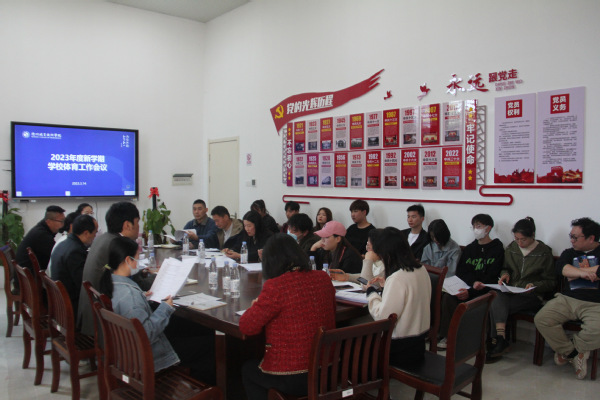 为明确新学期全校体育工作内容,广泛交流意见,3月14日下午,公共体育部召开2023年度新学期学校体育工作会议。会议由文化旅游学院院长郭大勇主持,教务处处长裴建兵、文化旅游学院副院长彭晓倩、公共体育部课程组长赵小龙、体测中心主任郑胜燕以及各二级学院副书记、辅导员、学生代表参会。