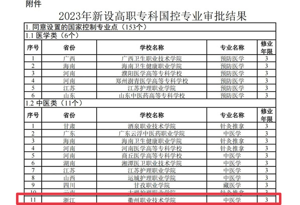 近日,教育部下发《关于公布2023年高等职业教育专科专业设置备案和审批结果的通知》(教职成函〔2023〕4号),我校申报增设的中医学专业,经专家评议和实地评估,并经国家卫健委、国家中医药管理局等行业主管部门审核,教育部审批同意增设,2023年开始面向普高类招生。