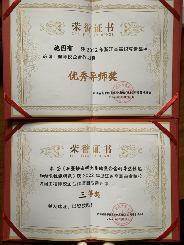 3月16日至17日,由省高等教育学会组织召开浙江省高职高专院校访问工程师校企合作项目培训会在义乌召开。经过现场汇报、交流、答辩等环节,我校李芸老师主持的《石墨掺杂稀土系储氢合金的导热性能和储氢性能研究》访问工程师校企合作项目,荣获“浙江省高职高专院校访问工程师校企合作项目成果”三等奖,其企业指导教师浙江巨化装备工程集团有限公司副总工程师施国有荣获优秀导师奖。