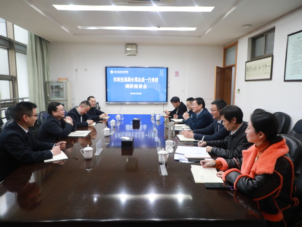 3月23日,市科技局党组书记、局长郑志成,党组成员、副局长郭峰,党组成员周波一行来校调研。校党委书记徐须实,党委副书记、校长吕延文陪同。