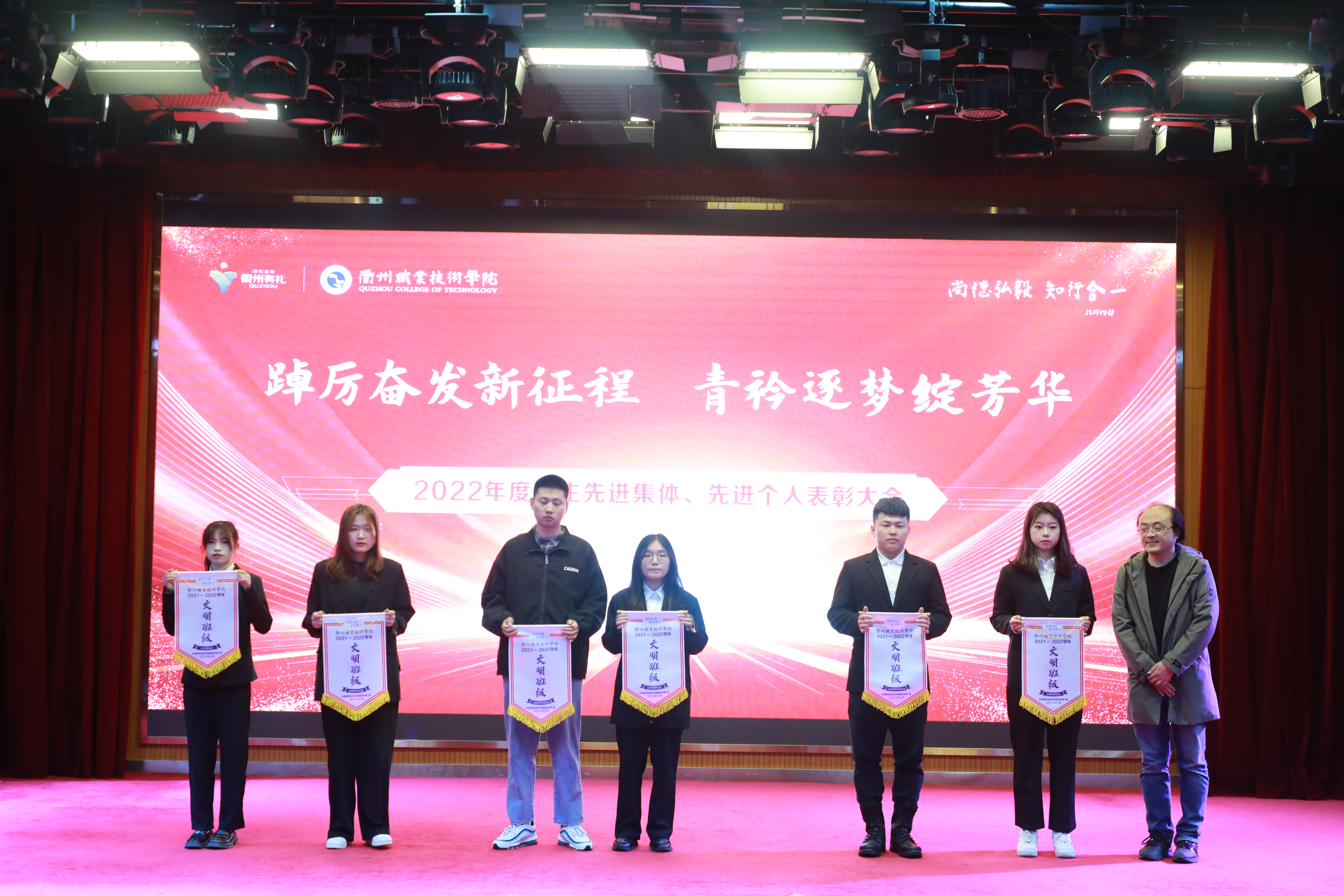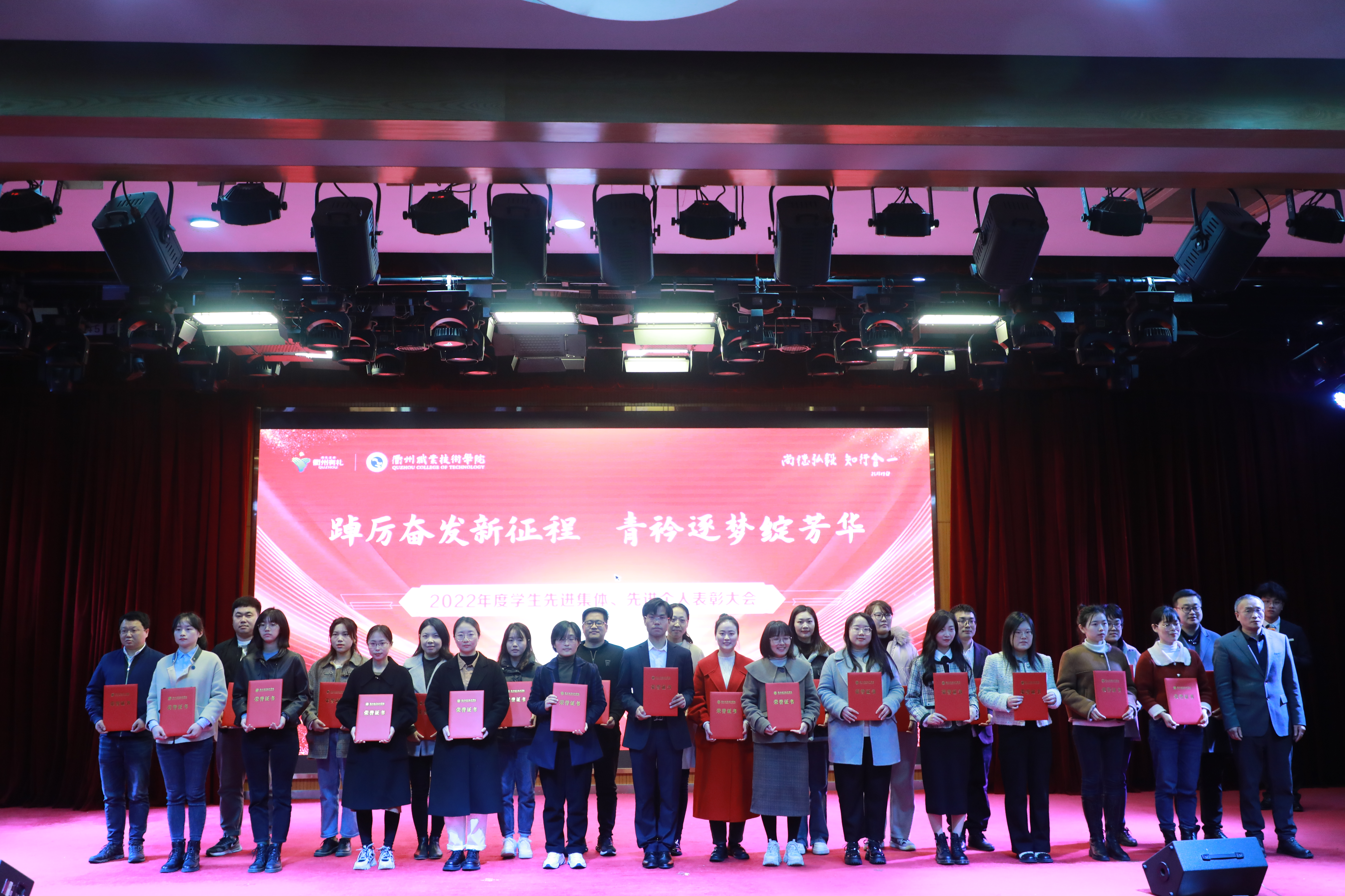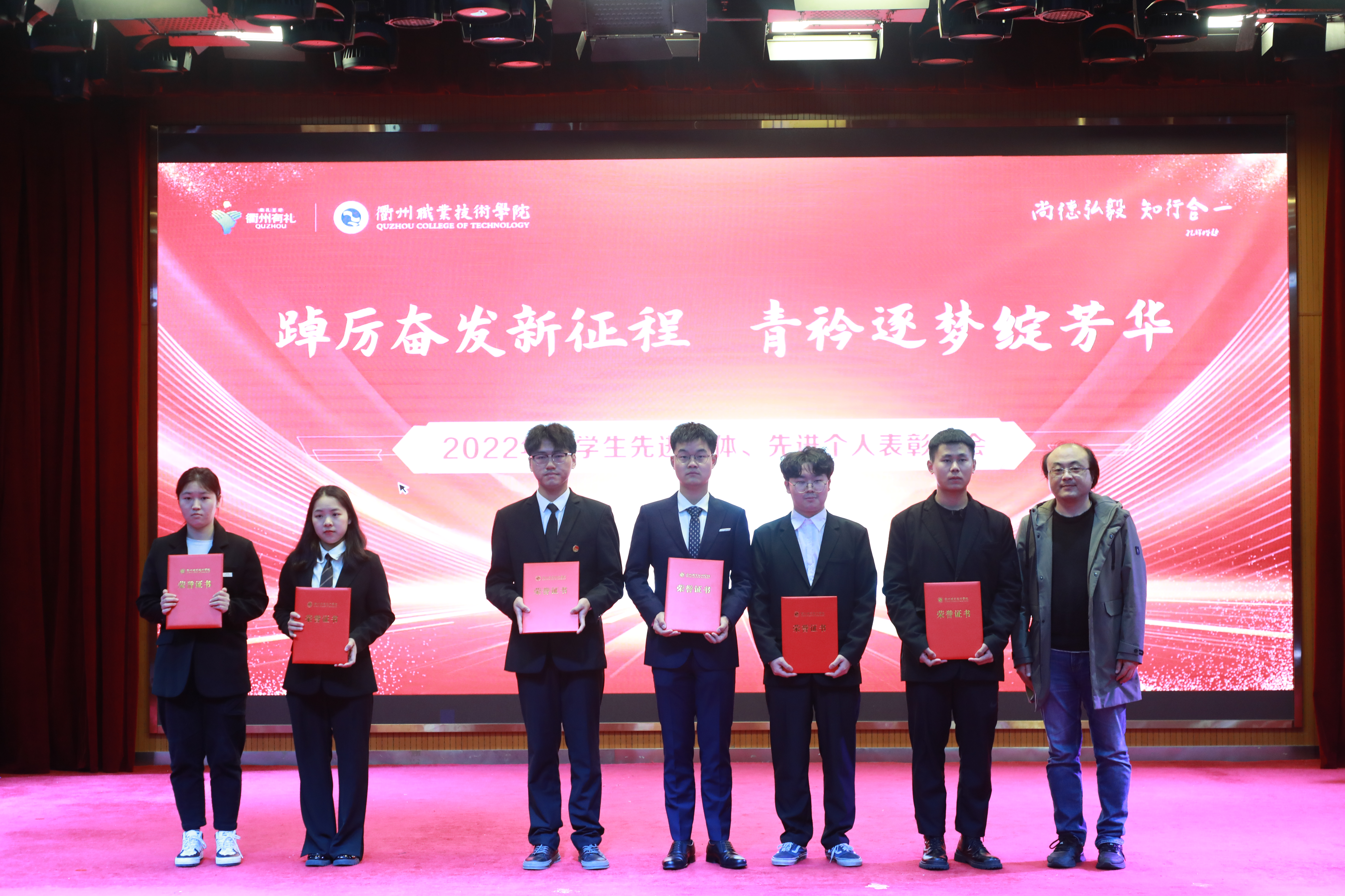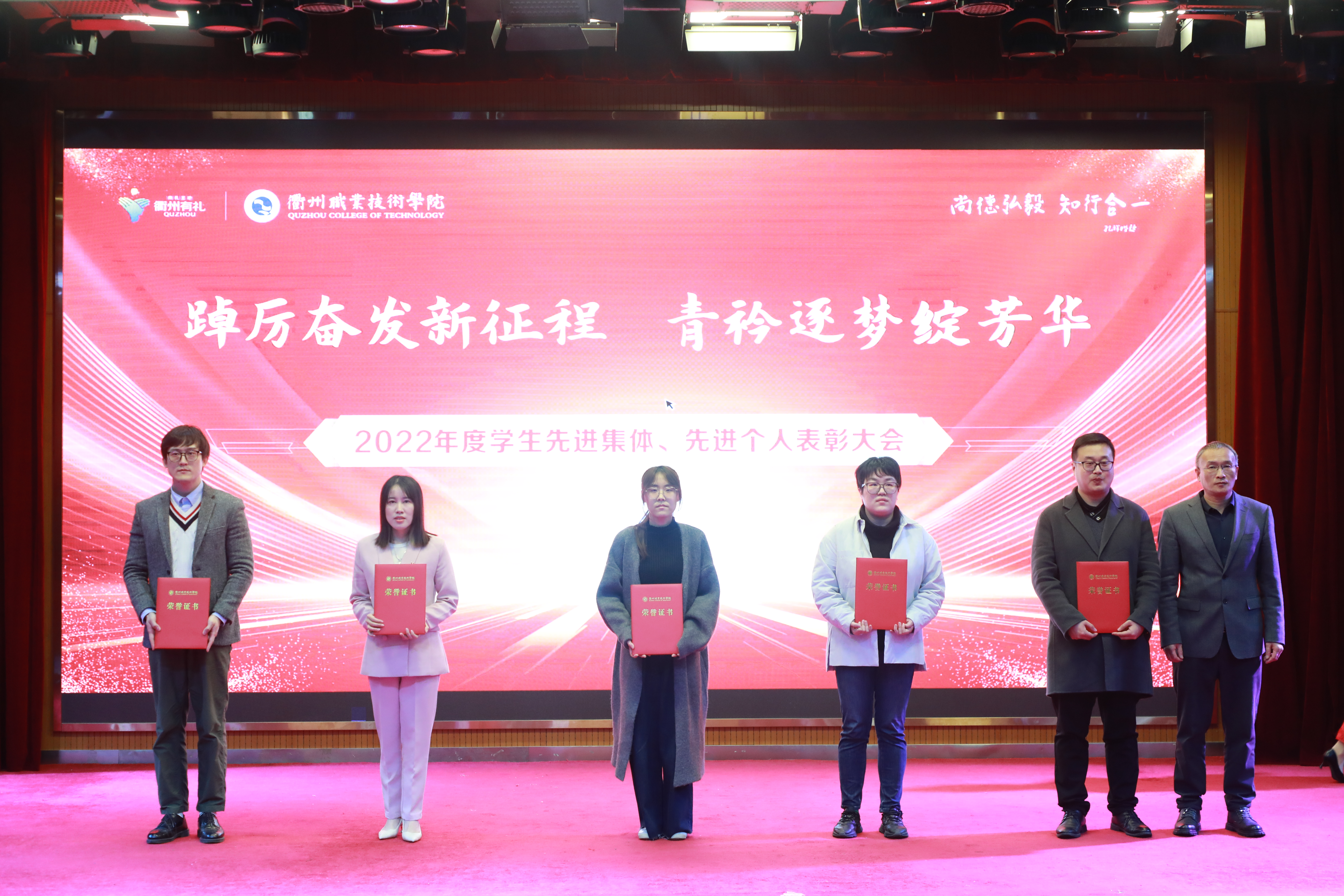 大会对获得国家励志奖学金、浙江省政府奖学金、校级奖学金、校十佳大学生等先进个人和校文明班级进行隆重表彰,与会领导为获奖代表颁奖。2022年,我校共评选优秀辅导员7人、优秀班主任34人,文明班级12个,国家奖学金获得者8人、省政府奖学金获得者142人、国家励志奖学金获得者204人、校级奖学金获得者1390人次;获校级十佳大学生12人,优秀学生、优秀学生干部等荣誉称号743人次。