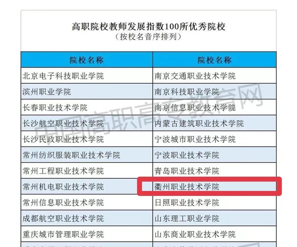 近日,中国教育科学研究院、全国职业高等院校校长联席会议编制的《2022中国职业教育质量年度报告》由高等教育出版社出版并正式发布,我校成功入选高职院校教师发展指数100所优秀院校名单,这是学校在“十四五”期间取得的一项重要成果。