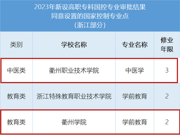 近日,教育部公布《2023年高等职业教育专科专业设置备案和审批结果》,衢州学院学前教育专业、衢职院中医学专业通过教育部国控专业审批。