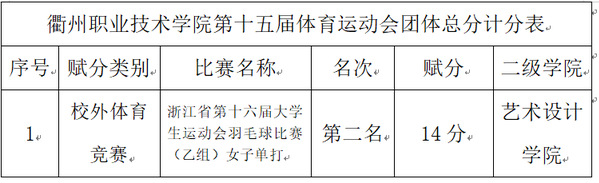 经过四天角逐,我校艺术设计学院22级摄影摄像技术专业学生沈宇婕摘得女子单打第二名的好成绩,创造了我校羽毛球项目在省级比赛中单项成绩的突破。同时,我校也获得了体育道德风尚奖。