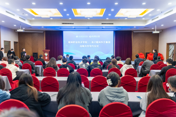 吕延文讲话,他指出,2023年,是“十四五”规划承上启下之年,是衢职院决战“双高”建设的冲刺之年,在学校发展的关键节点上与东方集团开展战略合作具有深远的意义。他希望,一是打造党建共同体,同频共绘校企同心圆。通过校企党建共同体共建活动,进一步凝聚共识,构建高效协同推进机制,进一步整合双方在党建、阵地等方面的资源优势,实现党务共建、资源共享、活动共办和党建品牌共创,进一步推动校企地协同育人、产教融合走实走深,推进服务衢州经济社会发展效能不断提升。二是建强师资实践基地,同力共培高素质人才。希望以“双师型”教师培养培训基地、教师企业实践基地签约为契机,进一步加强双方沟通联动,深化合作内涵,促进教师、员工业务能力同步提升,推进专业、产业协调发展,实现师资共建、资源共享、互利共赢。创新人才培养模式,为学生实践锻炼、创新创业提供资源支持和技术指导,衢职院也将积极发挥师资优势,为东方集团培育更多高素质技术技能人才。三是推动优势互补共赢,同向携手校企深度合作。希望今后探索更加丰富的校企合作新模式,经济管理学院要增强服务意识,主动对接企业需求,做好服务工作,寻求多渠道、宽领域的深度合作。衢职院也将在企业员工学历提升、职业技能培训、大型比赛活动承办等方面为东方集团提供支持。