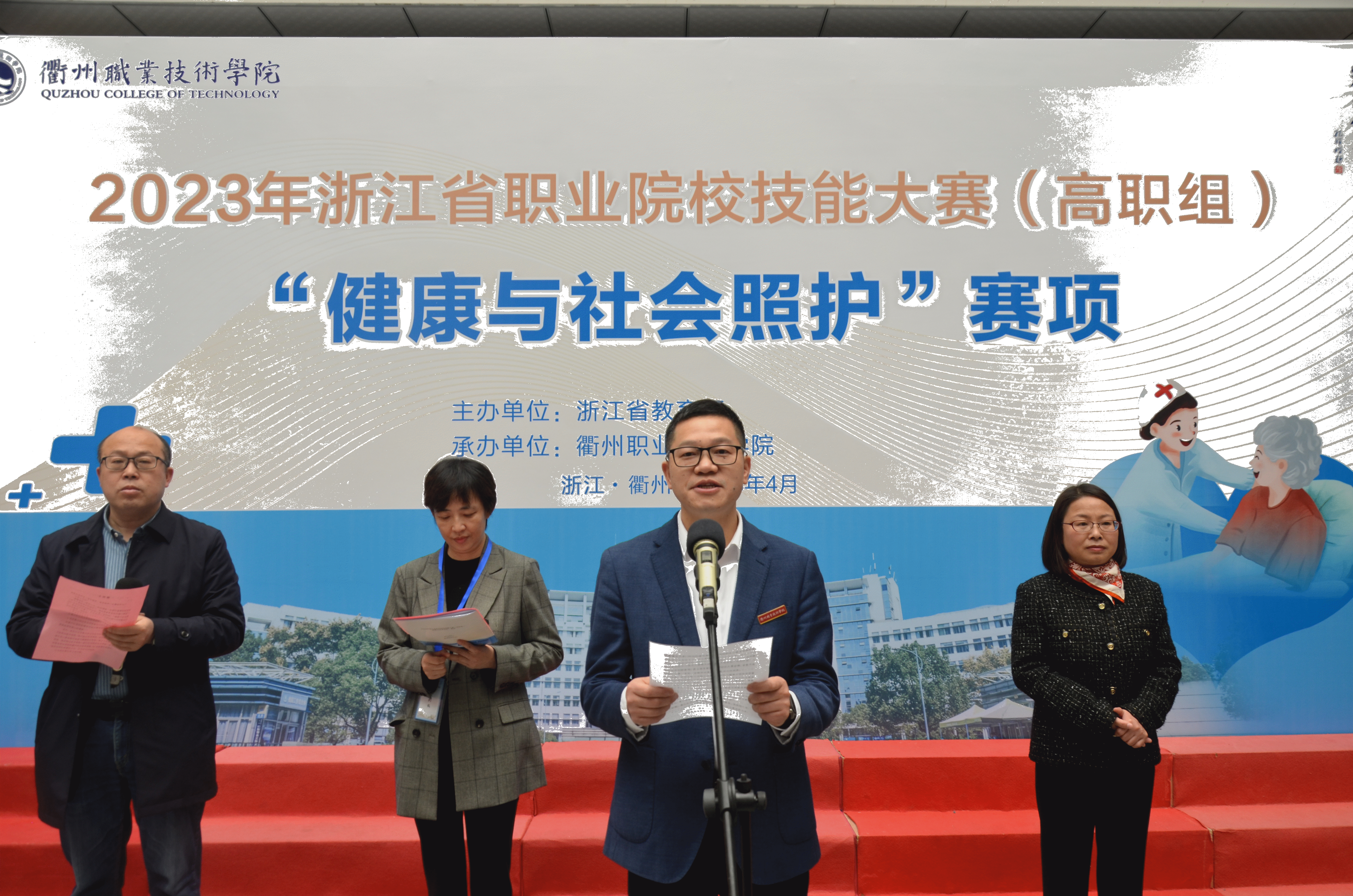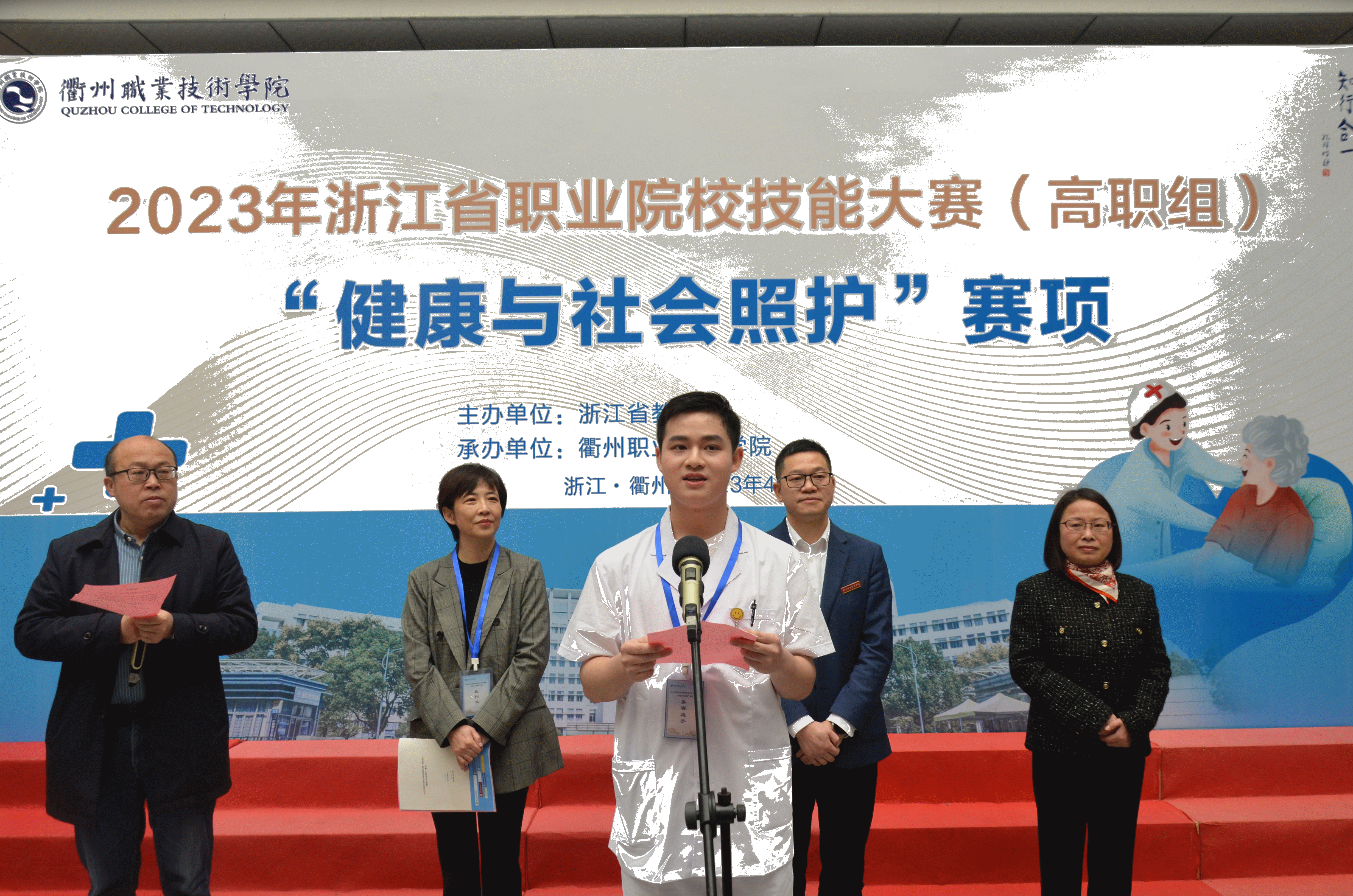 开赛式上,校党委委员、副校长姚水洪致辞,他首先代表学校对出席开赛式的各位领队、指导老师、参赛选手和裁判员表示热烈的欢迎和最诚挚的问候,对竞赛筹备组的工作人员表示最衷心的感谢。他指出,我国老龄化进程正在提速,为健康中国和共同富裕示范区培养更多的复合型健康照护人员,是我们卫生健康类院校共同的使命。“健康与社会照护”赛项在我校承办,是省教育厅对我校的信任,也是对学校办学实力、办学水平的充分肯定。我校一定严格按照大赛组委会的要求,精心组织,周密安排,保证赛事公平、公正、顺利、安全进行,为大赛各阶段、各环节、各流程提供有力保障。随后,裁判长及参赛选手代表分别进行了表态发言。