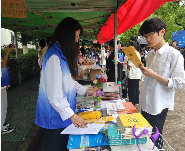 二手交易市场活动中,同学们将闲置的书籍、衣物、生活用品等委托给大发同学统一“售卖”,大发同学在“市场”上大声吆喝,吸引了同学们的积极选购。货物中有一批专升本的复习资料,由专升本的大三同学提供,不仅实现了资源的循环利用,也是学长学姐努力向上的精神的传递。