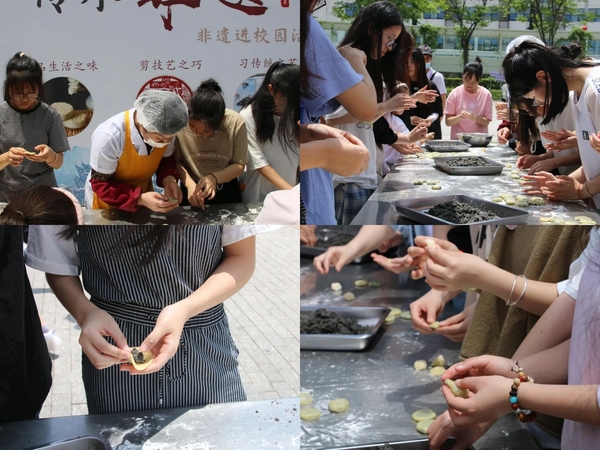师傅展示制作麻饼的技艺,引来师生们阵阵赞叹。现场同学们跟随师傅学习制作麻饼。麻饼外面裹着白芝麻,里面含着黑芝麻,口口芝麻香。