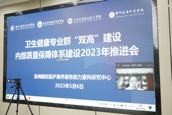 5月6日,卫生健康类专业群“双高”建设内部质量保障体系建设2023年推进会在我校举行。全国卫生健康职业教育教指委副主任委员、天津医学高等专科学校校长张彦文线上出席,浙江省卫生健康类职业教育行指委副主任委员、宁波卫生职业技术学院校长贾让成,漳州卫生职业学院校长何坚,党委委员、副校长陈义三,浙闽赣皖医护康养服务能力重构研究中心主任胡野,我校党委书记徐须实,校长吕延文,党委副书记何百通等出席,党委委员、副校长姚水洪主持。