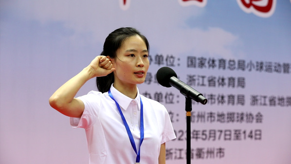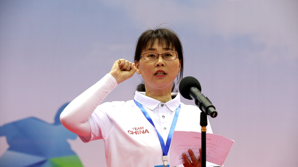 地掷球国家一级裁判员徐惠芳代表全体裁判员宣誓。