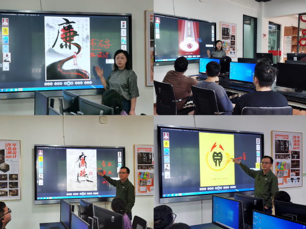 “导师们一致的意见是背景文字要改,一篇和廉相关,另一篇和洁相关”“海报的背景做得有一点脏,晕染过渡得不够干净”“注意一下海报的安全出血”“海报目前最需要调整的是层次不够分明”“试试黑宋体吧,印章小一些”“我再加一句‘公生明 廉生威’,脸谱视觉上增加一点威严的感觉”“这样的阴影效果是不是好一些”……